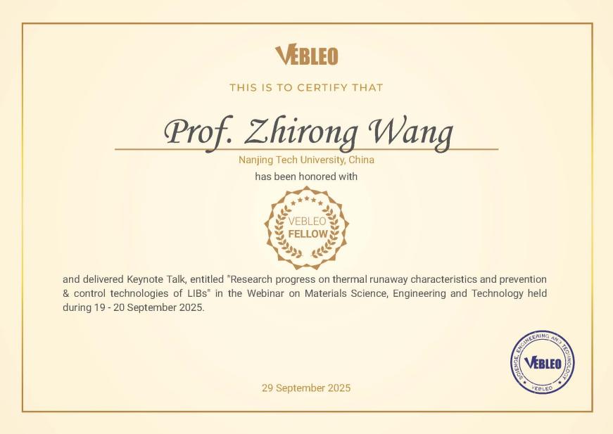 近日,我院王志荣教授被国际科学组织授予Vebleo协会会士(Vebleo Fellow),并受邀在 Vebleo主办的网络国际会议上,做了题为“Research progress on thermal runaway characteristics and prevention & control technologies of LIBs”的学术报告。王志荣教授介绍了研究团队在锂离子电池热失控机理、预警和防控技术,以及应用于储能电站热灾害防控方面的最新研究成果。