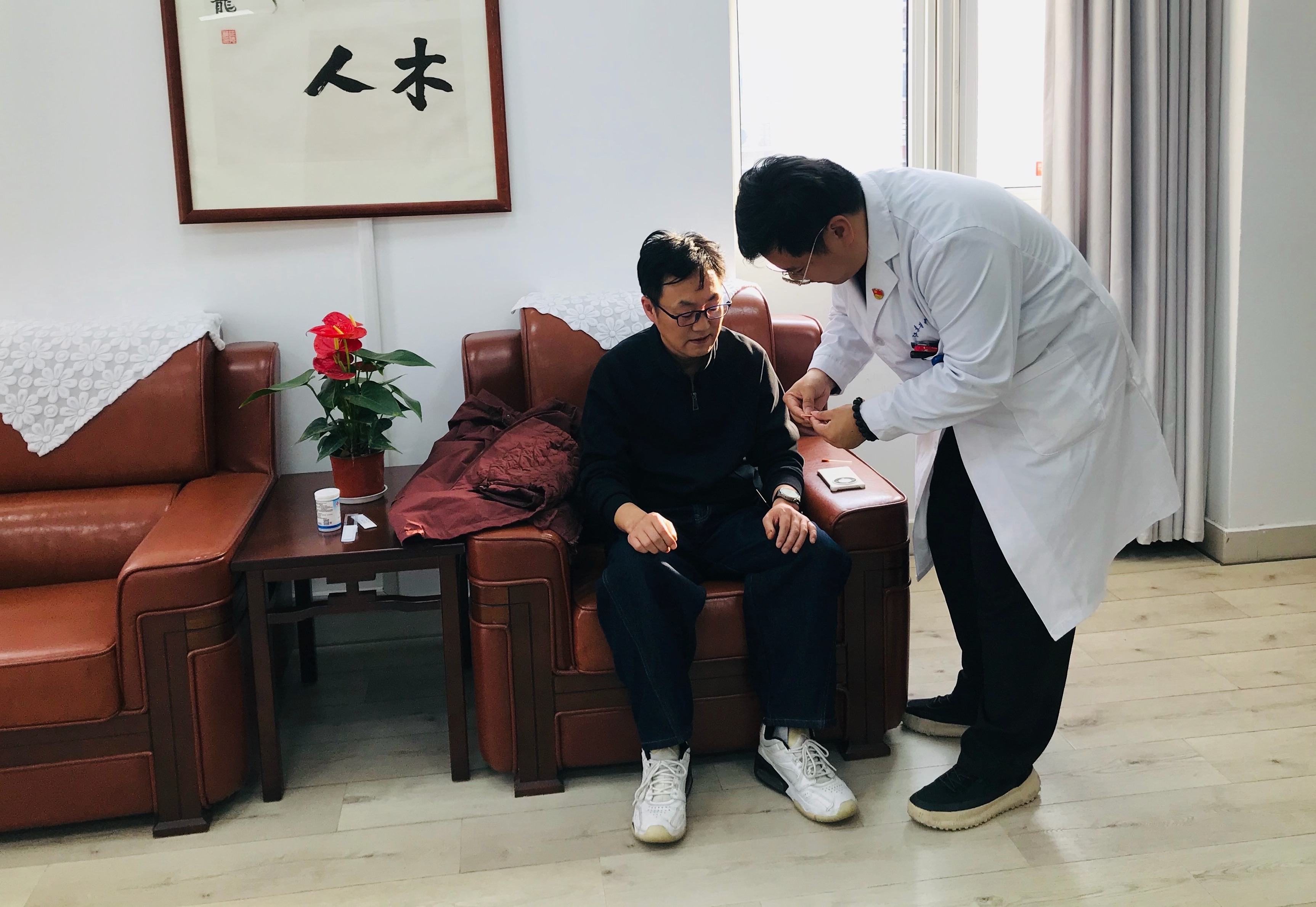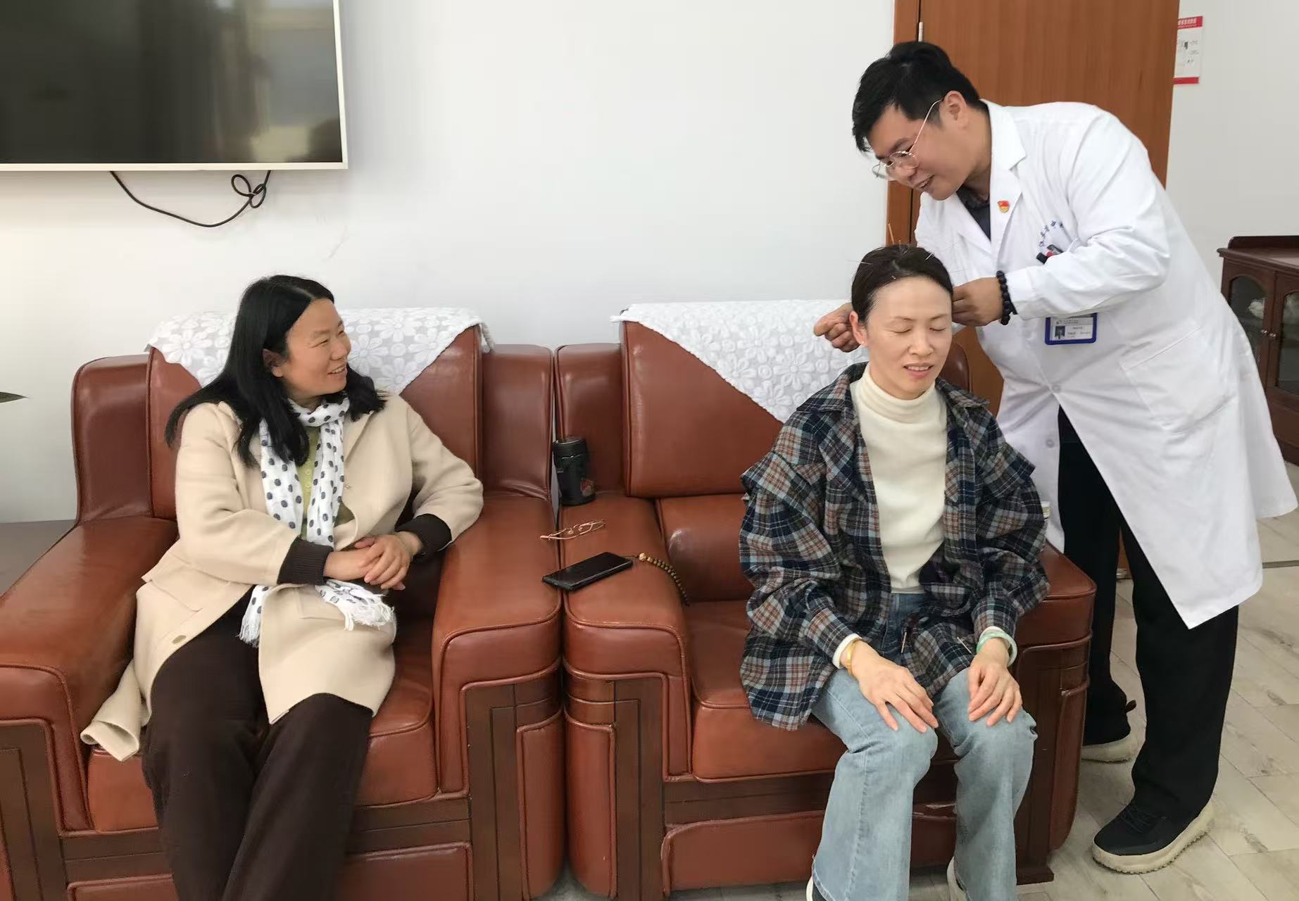 专题讲座结束后,中医外治特色义诊活动随即展开。江苏省中医院专家团队阵容强大,医学博士、神经内科针药结合组长李昀泽副主任中医师亲自坐诊,为教师们提供专业针灸服务。现场设置了体质辨识与咨询区、中医刮痧拔罐体验区、耳穴压豆体验区、艾灸体验区及针灸诊疗区五大功能区域。教师们按需有序参与,气氛热烈而有序。